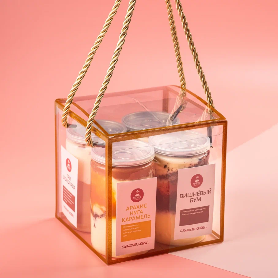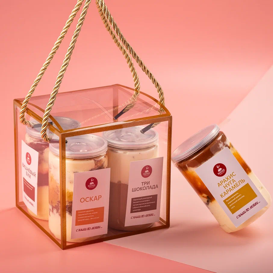 Набор можно составить из 4 баночек разными вкусами. Цена набора зависит от выбранных десертов. На сайте указана максимальная стоимость товара.