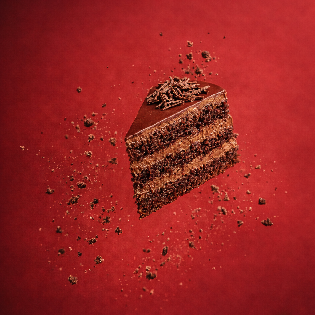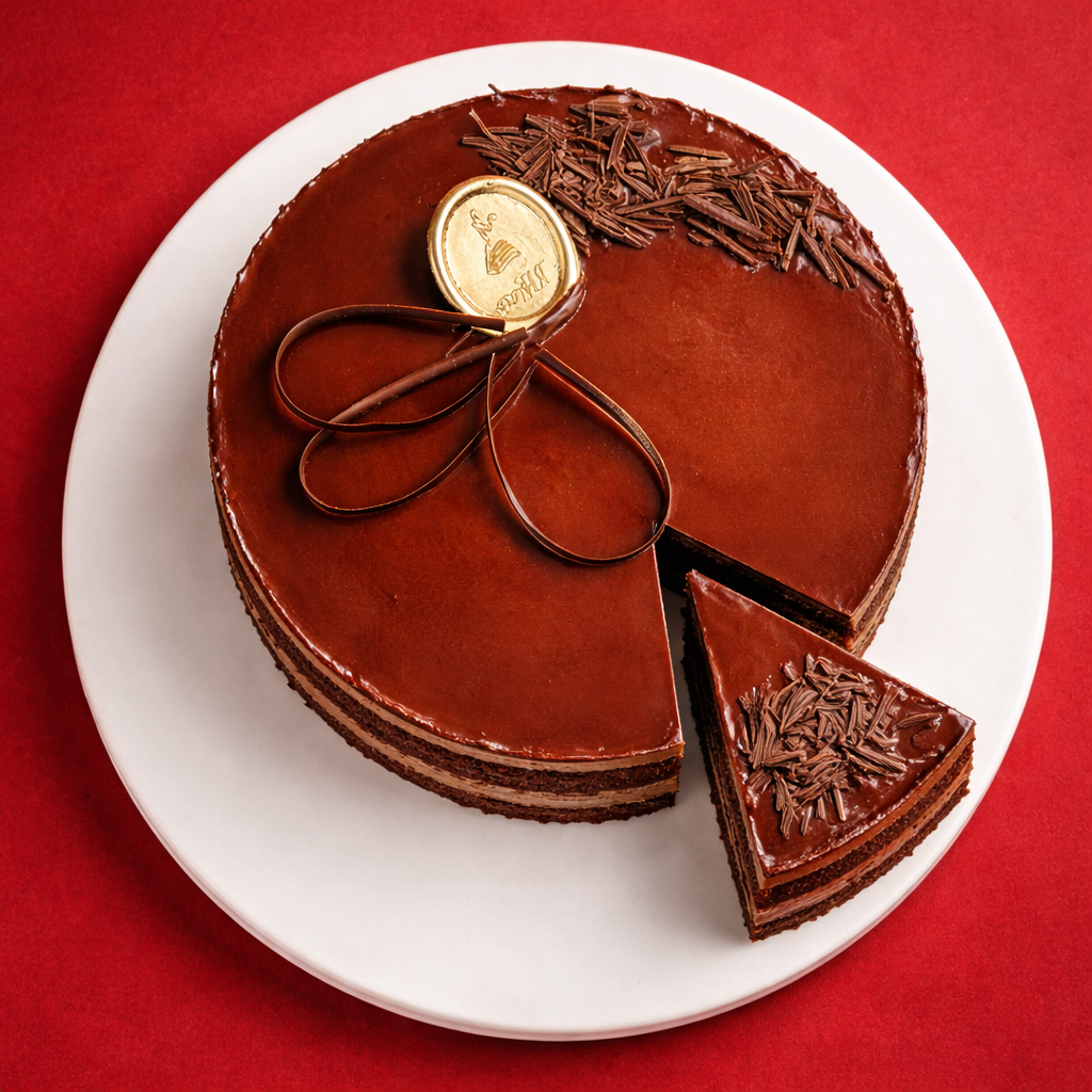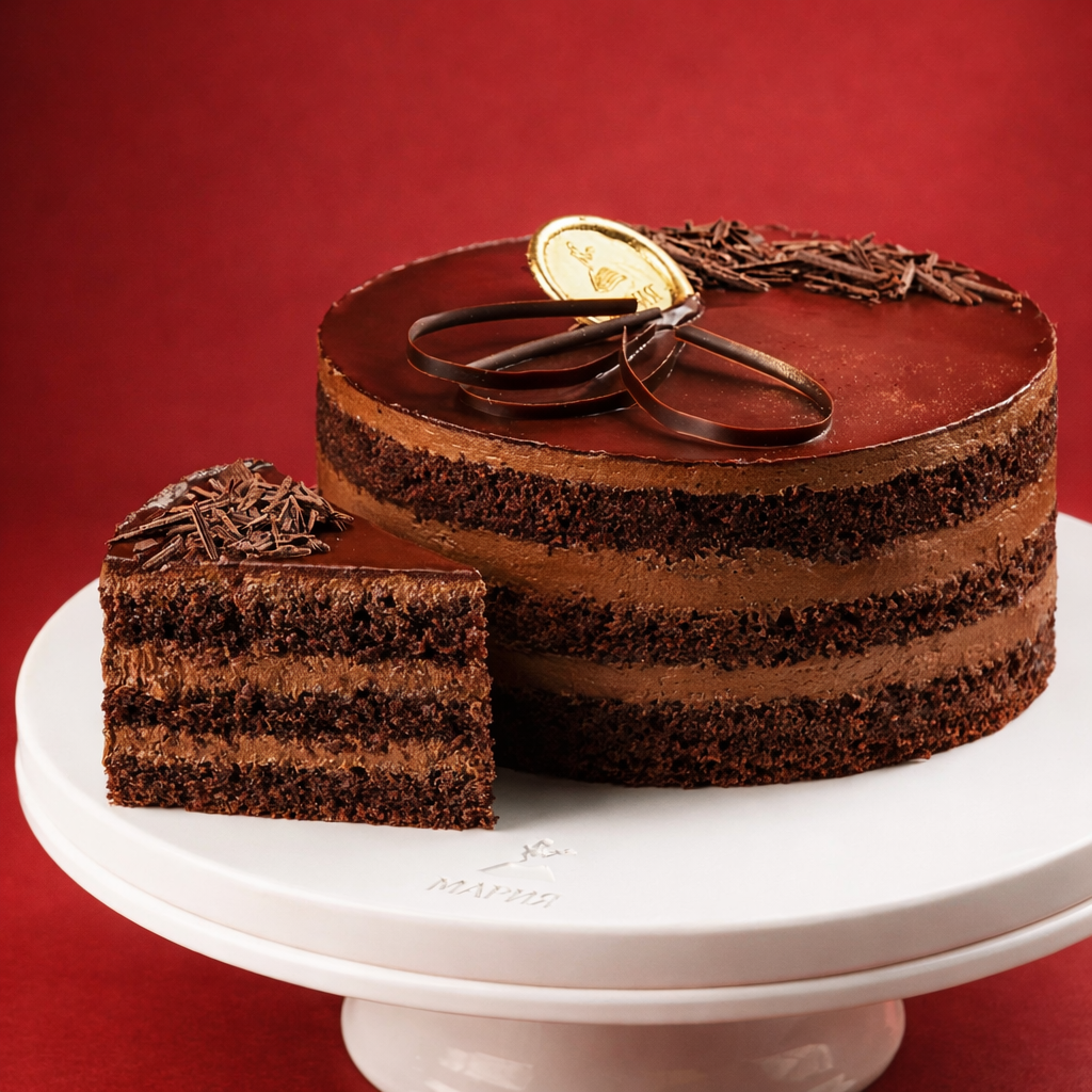 Воздушный шоколадный бисквит, нежный сливочный крем с варёной сгущёнкой, шоколадный декор, шоколадная глазурь.