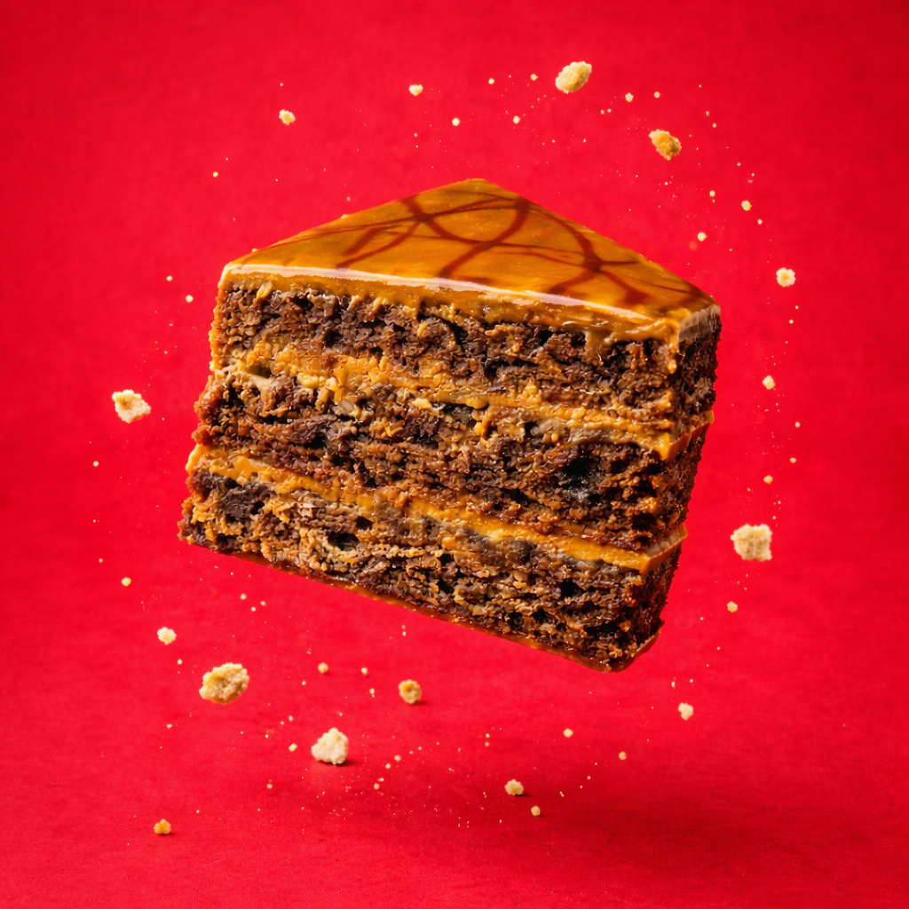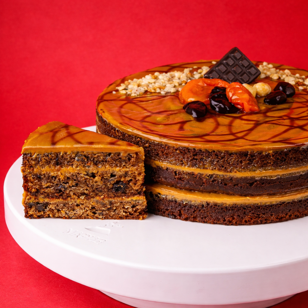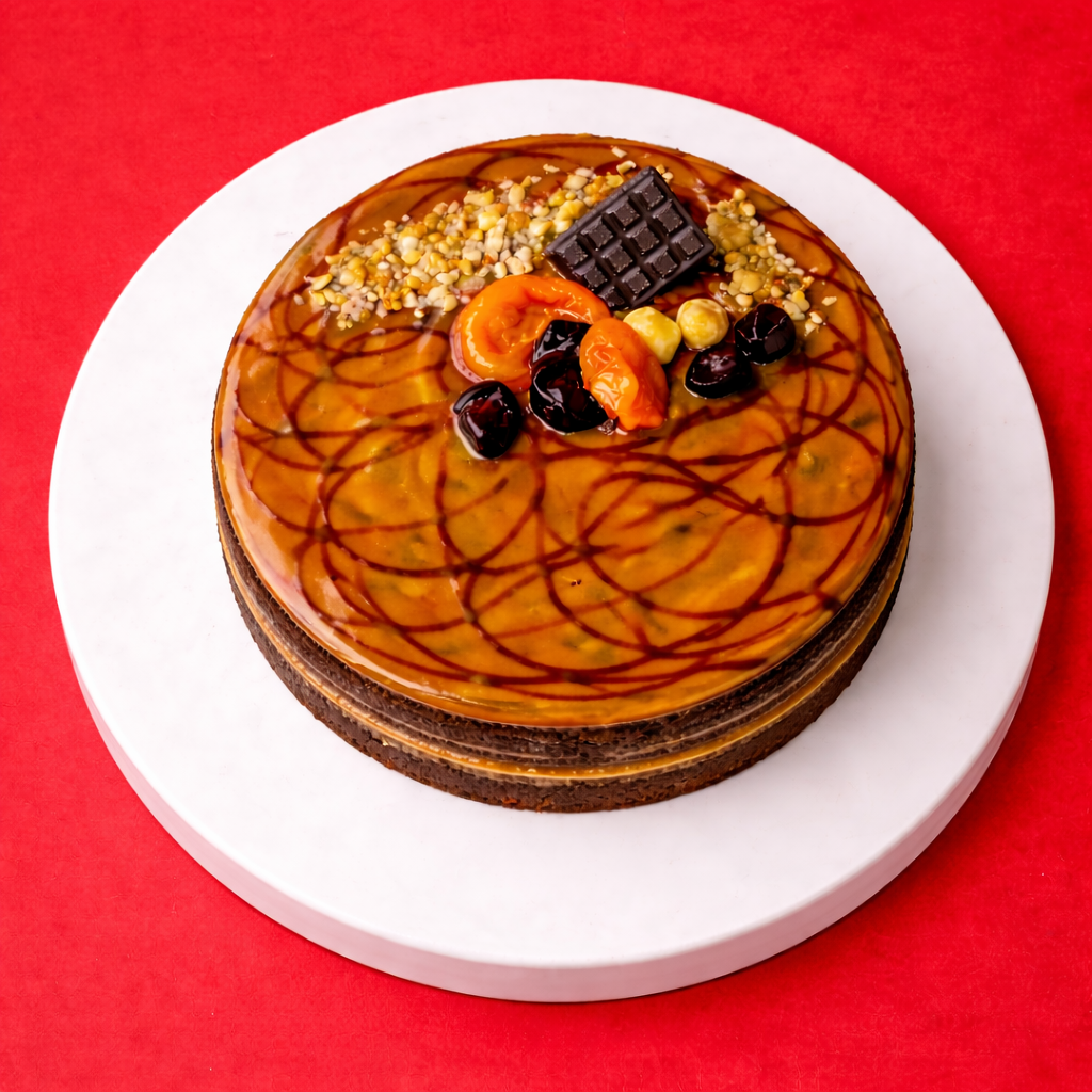 Состав:Мука в/с, яйцо 1с, сахар, маргарин, курага, чернослив без косточки, сметана-15%, грецкий орех, ванилин, молоко сгущенное вареное, гель нейтральный, ядра абрикоса, шоколадная глазурь.