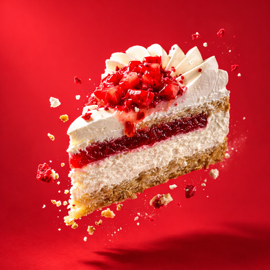 Яйцо, мука в/с, сахар-песок, сливки 33%, сыр маскарпоне, сыр креметте, клубника, ваниль, сублимированная малина.
