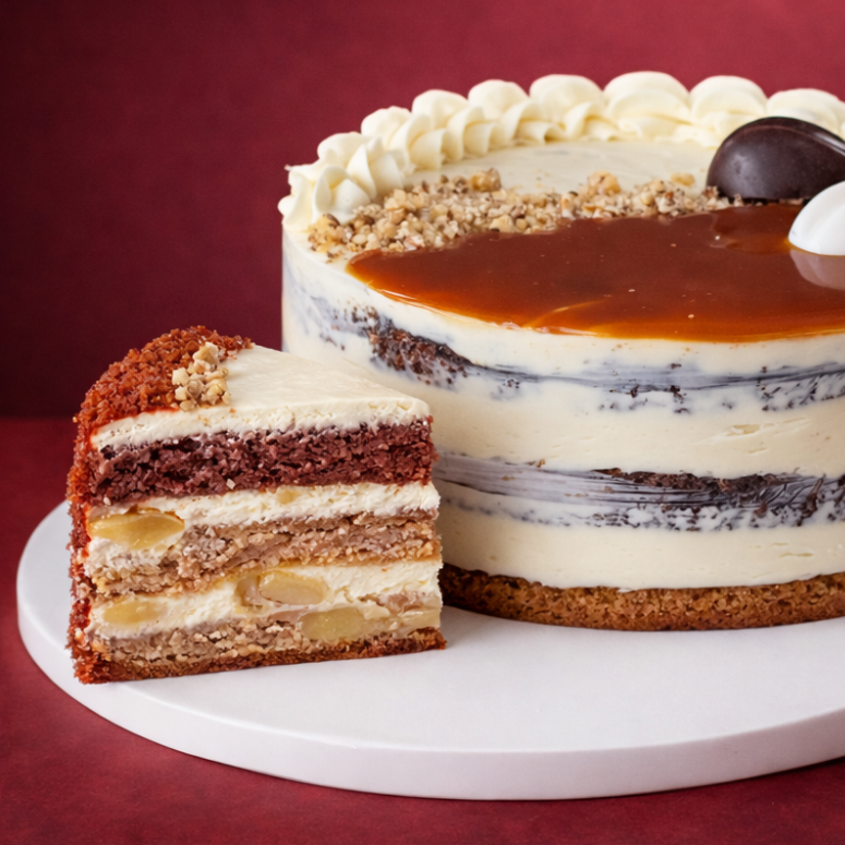 Этот восхитительный торт представляет собой пропитанный молоком воздушный шоколадно-ванильный бисквит, нежный крем, созданный на основе творожного сыра. Прослойки из вареного сгущенного молока с добавлением дробленого грецкого орешка и кусочков консервированного ананаса делают его вкус неповторимым. Торт украшен соленой карамелью, посыпан дробленым грецким орехом, а также добавлены шоколадно-карамельные конфеты Toffifee, что придает ему по-настоящему изящный вид. Идеальный выбор для сладкоежек и тех, кто любит сочетание разных вкусов в одном десерте.