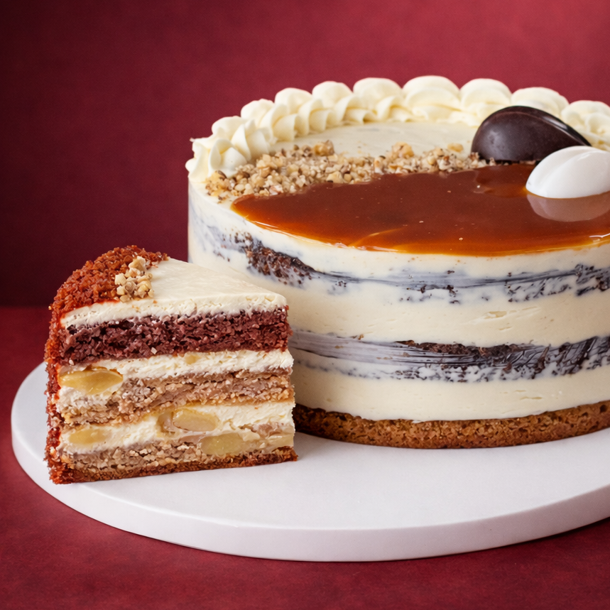 Бисквит шоколадно-ванильный, сырный крем, вареное сгущенное молоко, грецкий орех, консервированный ананас, соленая карамель,