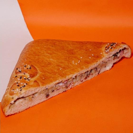 Воздушное рублено-дрожжевое тесто, начинка с картофелем, грибами, беконом и луком, посыпанная кунжутом.